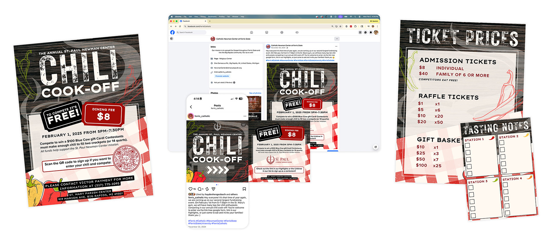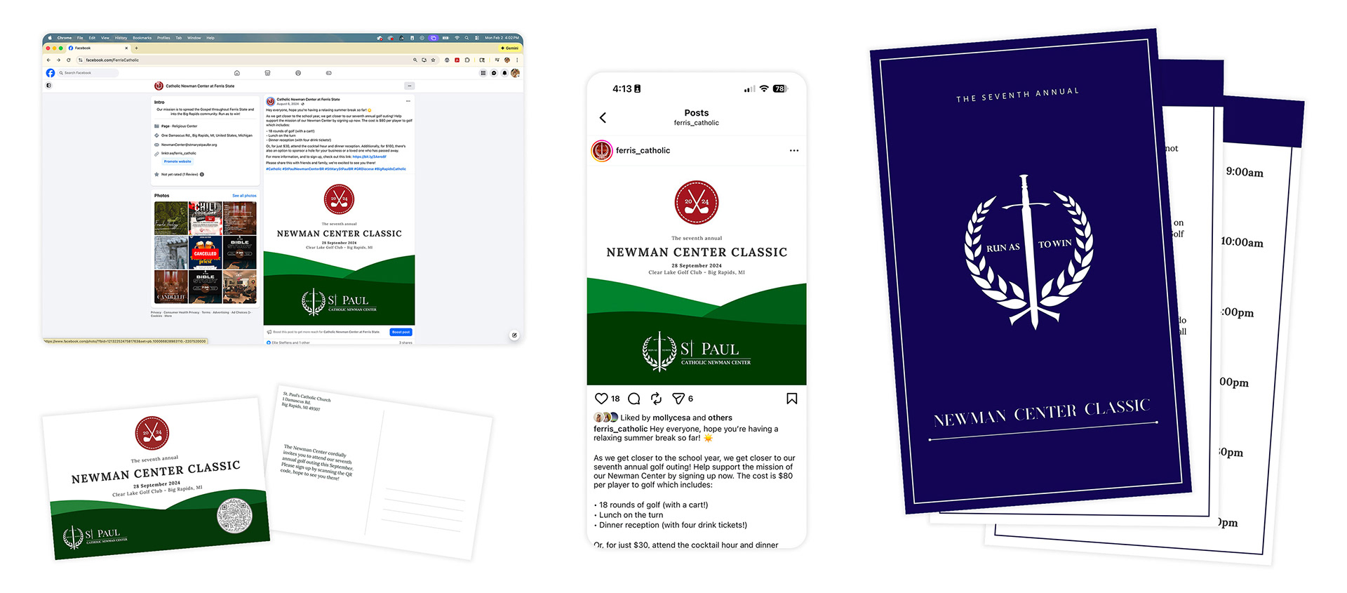 The Newman Center holds two major fundraisers per year, the Newman Classic Golf Outing and Chili Cook-Off. Promotional materials for these events include social media, website, posters, signage, postcards, sign-up forms (digital and print), booklets, giveaways, and more.