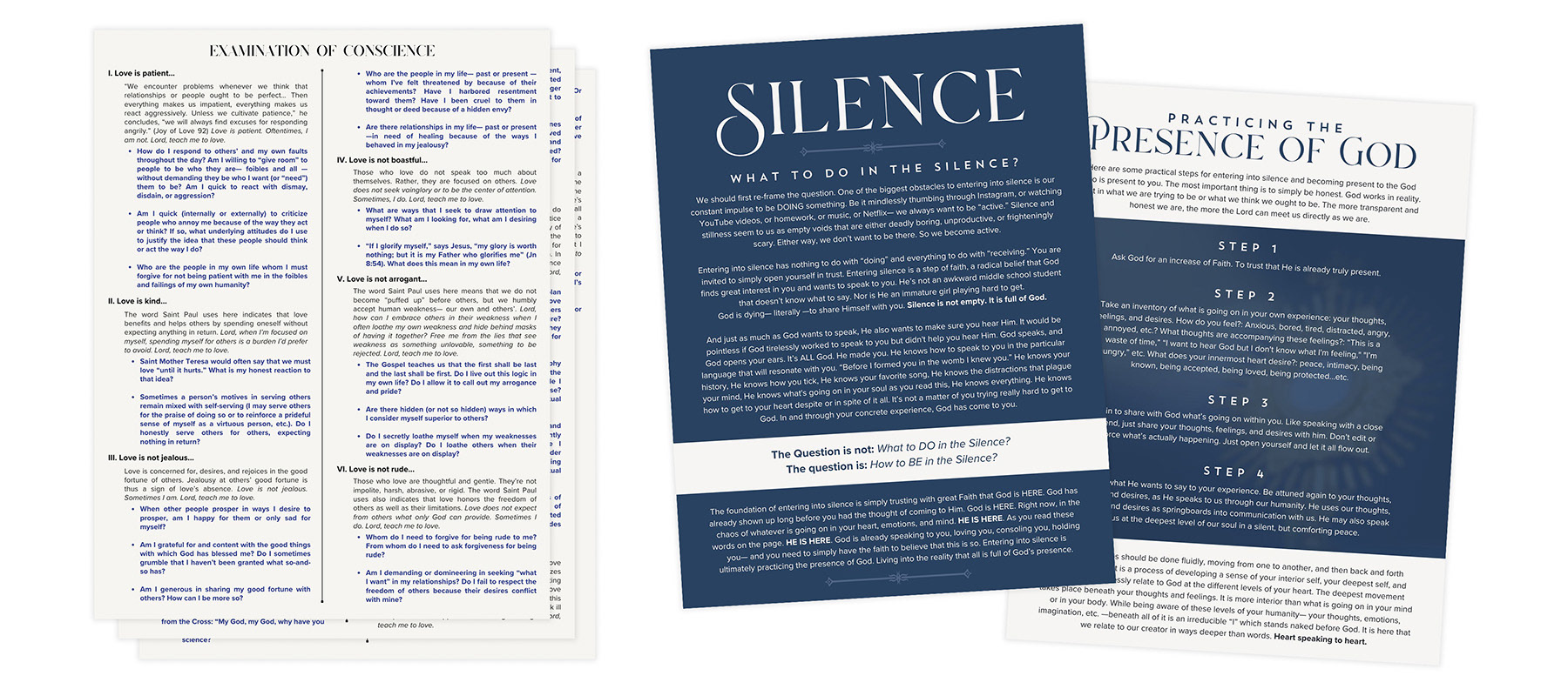 Materials providing in retreat folders include an examination of conscience, how to enter into silence, and other various materials depending on the retreat theme.